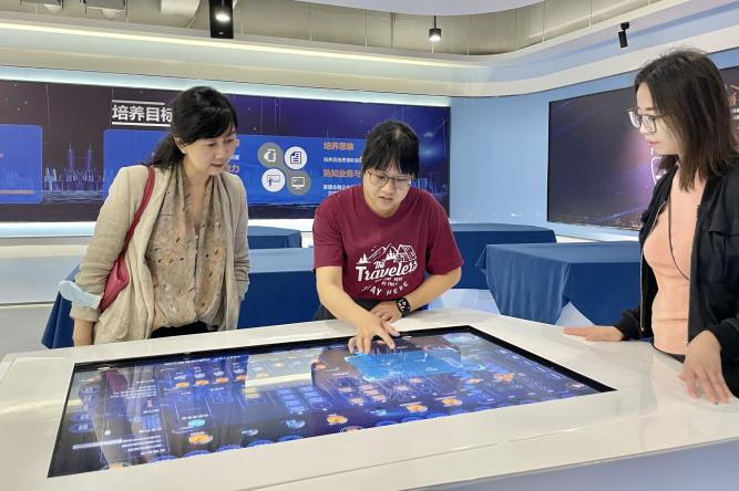 在我校人员陪同下,乐卓博大学代表参观了大数据与人工智能实验室、金融综合虚拟仿真实训室、桃花岛电商孵化中心、动漫游戏产业学院及健康医学院,深入了解了学校的教学设施与产教融合实习实践平台。