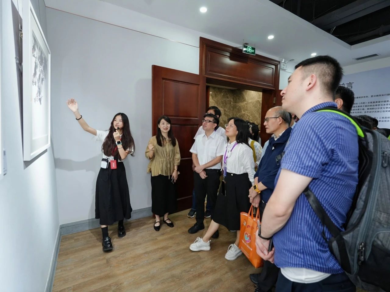 参访团还观摩了广州华商学院创意与设计学院承办的“笔意交响”AI数字艺术展。展览创新性地融合中国传统水墨、工笔、书法艺术与人工智能技术,充分展现了学院在艺术与科技交叉融合领域的前沿探索。嘉宾们不仅领略了中华传统艺术的深厚底蕴,也深刻体会到科技创新为艺术表现形式带来的广阔空间。