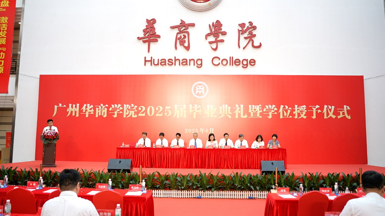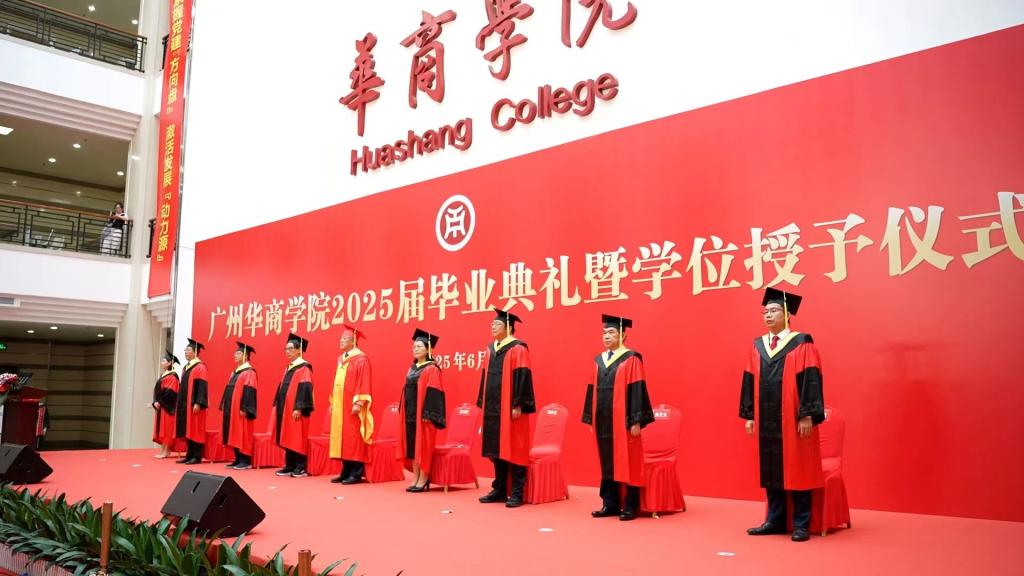 2025年6月21日上午,广州华商学院2025届毕业典礼在广州校区中央图书馆大厅隆重举行。10328名毕业生身着学位服,在师长的殷切期盼中完成人生重要蜕变,带着“厚德、励志、博学、创新”的校训精神,踏上服务社会、报效国家的新征程。广州华商学院校长胡军教授、党委书记陈玉欢,广州华商学院首席科学家陈新滋院士,副校长范忠宝、刘少波、焦方太、吕峻闽、余家军、许娜,华商科教集团副总裁刘文琦,学校顾问王锦秀,校长助理、各二级学院领导、职能部门负责人与师生代表、毕业生家属共赴这场青春盛典、共享2025届毕业生的喜悦,为成长喝彩,为青春加冕。本次典礼以线上+线下的方式同步进行。