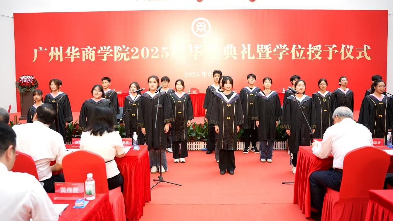学校副校长、学校学位评定委员会副主任范忠宝教授宣读《广州华商学院关于2025年6月普通高等教育本科毕业生学士学位授予的决定》。学校校长胡军教授,党委书记陈玉欢,广州华商学院首席科学家陈新滋院士,副校长范忠宝、刘少波、焦方太、吕峻闽、许娜,共同为2025届毕业生代表授予学位。