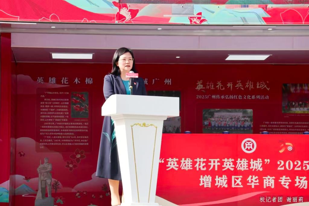 广州市委宣传部、增城区委宣传部、增城区委党史研究室、增城区教育局、增城区文联、广州华商学院、荔湖街道办等有关单位的领导嘉宾及我校广州校区500多名师生共同见证巡展活动“英雄旗”授旗仪式。旗帜在市区两级领导手中庄严挥舞传递,象征着“赏英雄花、游英雄城、传英雄志、弘英雄气”的红色使命在增城、在华商落地生根。