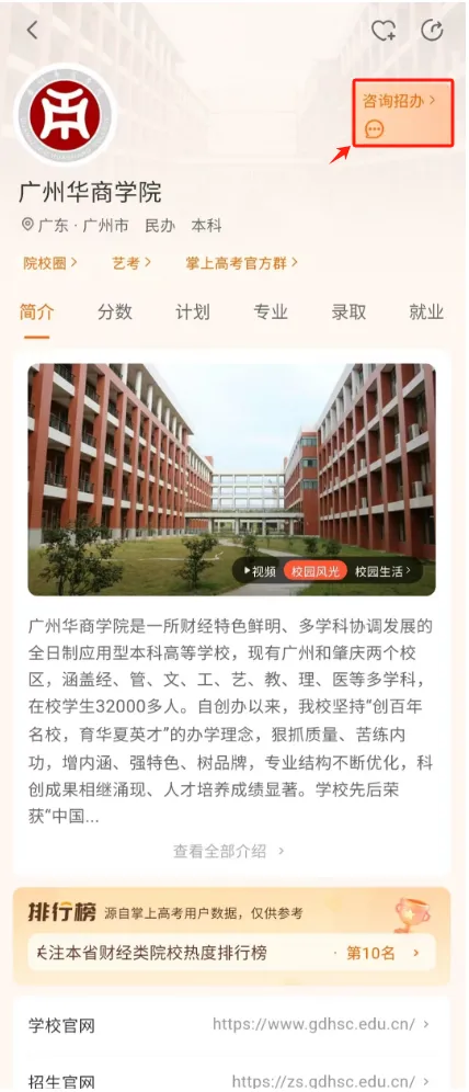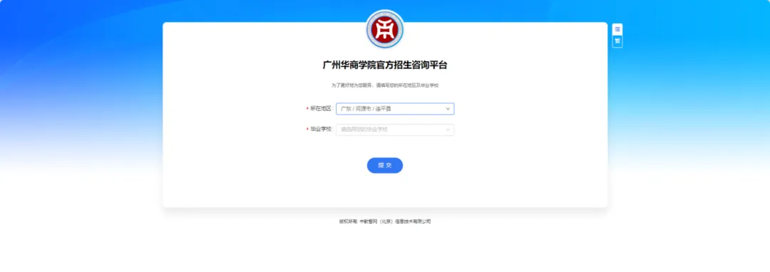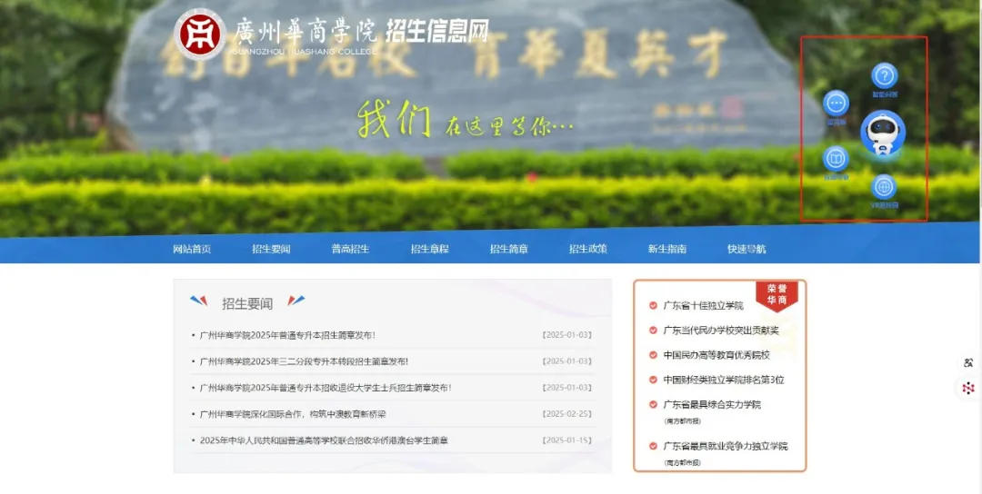 方式二:广州华商学院招生信息网登录广州华商学院招生信息网(网址:https://zs.gdhsc.edu.cn/),点击右侧“智能机器人小招”,在登录界面完善基础信息后即可在线咨询或留言。