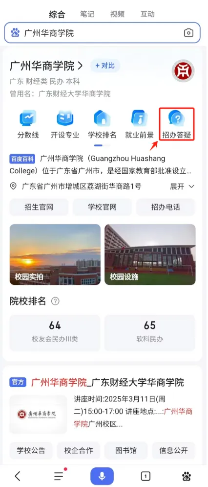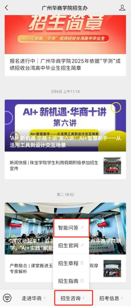 方式一:广州华商学院招生办微信公众号关注后可进入到“【广州华商学院招生办】”微信公众号主页,点击底栏“招生咨询”菜单栏的“智能问答”即可在线咨询。公众号招生咨询平台问答页同时支持语音提问。