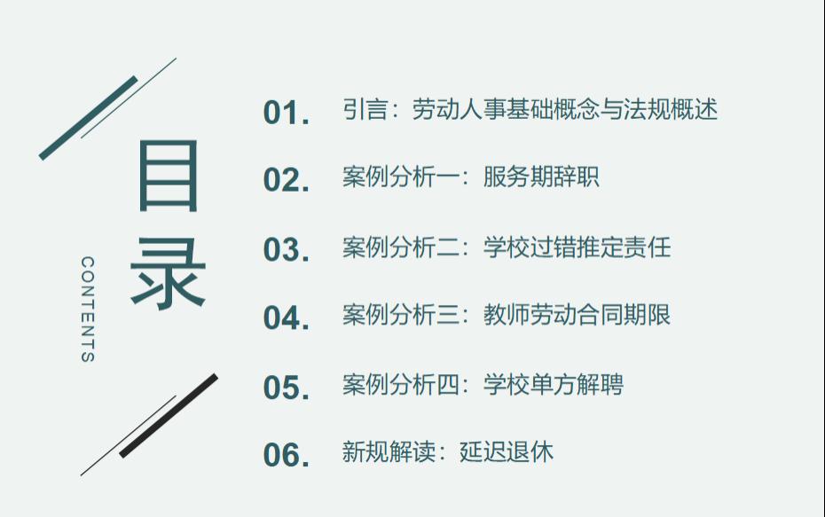 黄静律师讲解劳动法律基础概念和法律体系;结合广东省高级人民法院发布的劳动争议十大典型案例“某医院诉陈某劳动争议案”,讲解服务期和违约金规定;结合江西省高级人民法院发布的弘扬社会主义核心价值观十大典型案例“学生出事案”,讲解学校和教师应如何履行教育管理职责;结合司法实践案例,讲解教师聘用合同管理和与学校的规章制度;从背景、目的及具体方案等角度解读新规“延迟退休政策”。