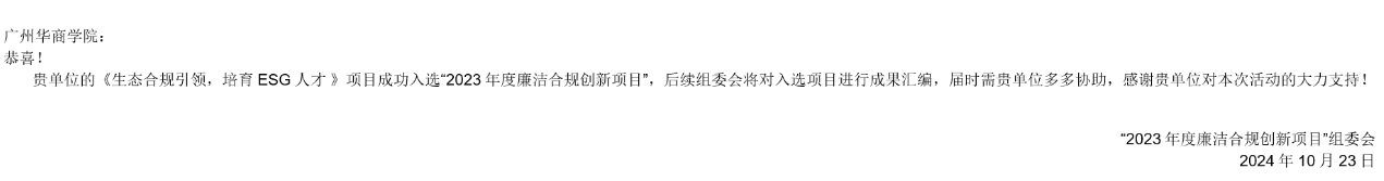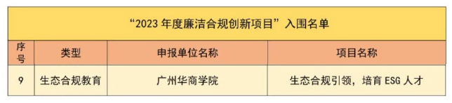 近日,广州华商学院ESG研究院联合华商教育集团精心打造的“生态合规引领 培养ESG人才”创新项目,在全省众多竞赛项目中脱颖而出,成功入围广东省2023年度廉洁合规创新项目,成为仅有的9项入围项目之一。这不仅是对我校办学成果的肯定,更是对我校ESG人才培养特色的高度认可!
