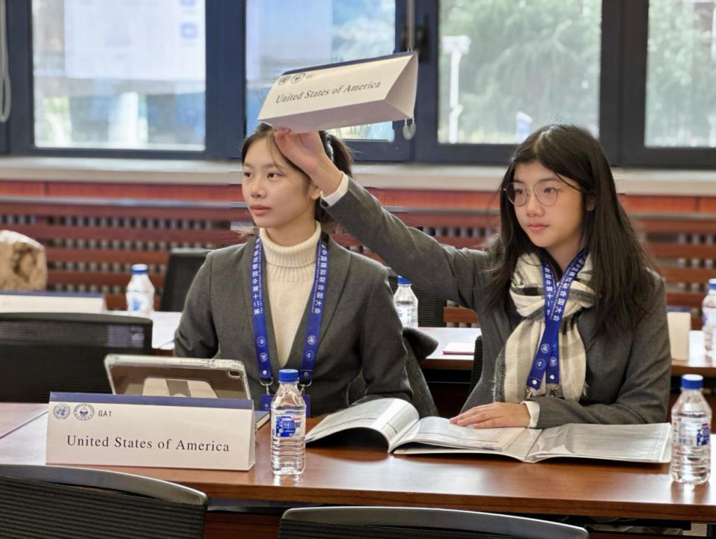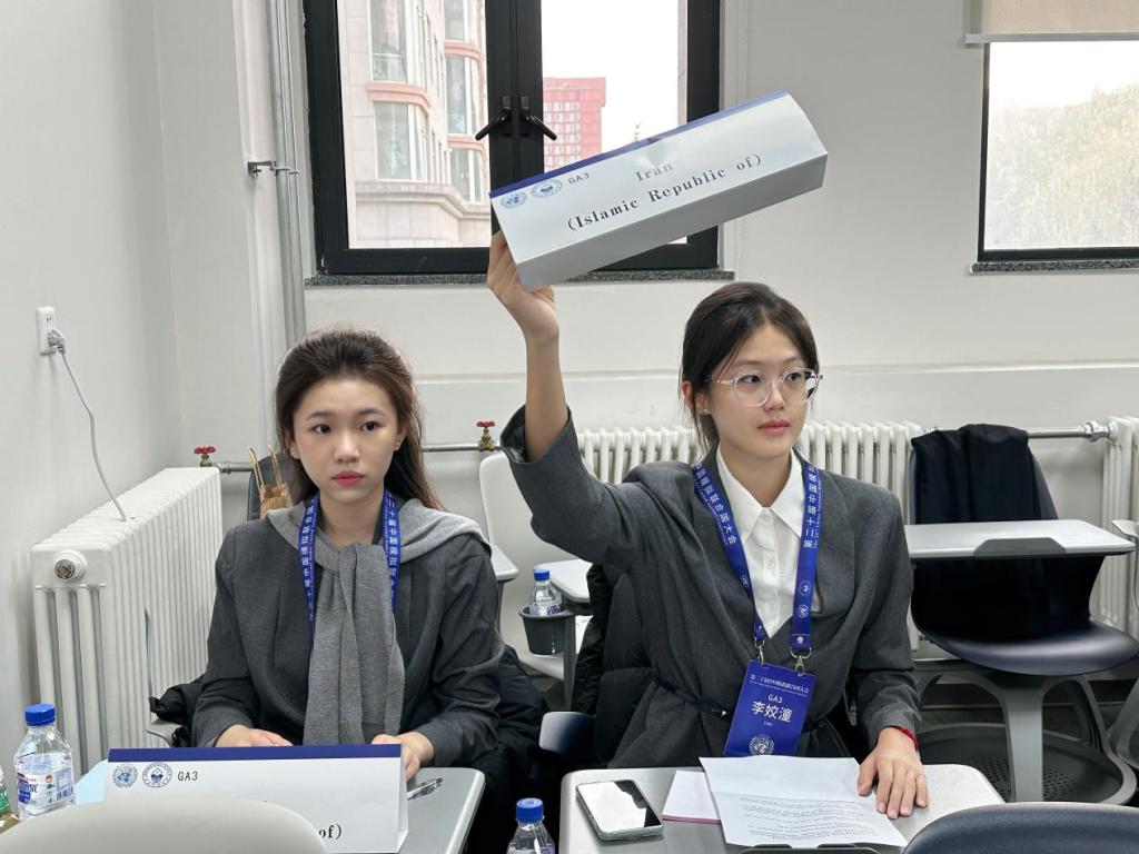 此次大会开设了“联合国大会第一委员会(UNGA1)”“联合国大会第三委员会(UNGA3)”“联合国教科文组织(UNESCO)”等七个会场。我校石睿妮、劳雅怡同学代表美国在“联合国大会第一委员会(UNGA1)”讨论——巴以冲突的和平解决方案;骆欣谊、李姣潼同学代表为伊朗在“联合国大会第三委员会(UNGA3)”讨论——战乱冲突地区的难民安置与流离失所者的人权保障。她们与来自北京师范大学、北京外国语大学、国防科技大学等知名高校学子共同探讨了国际热点问题,发挥创造性思维,进行批判性思考,寻求全球性问题的解决方案。