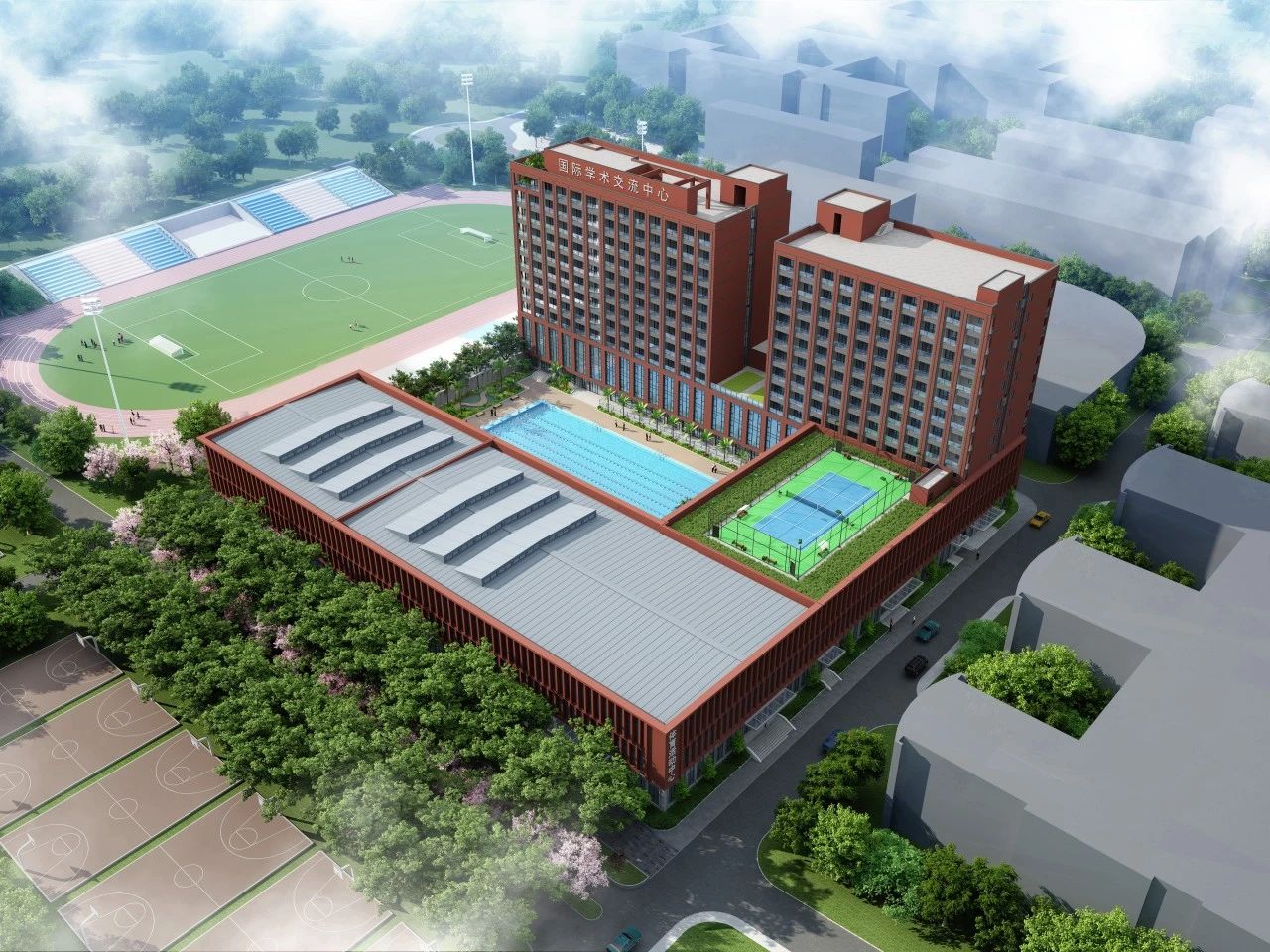 广州华商学院体育中心总建筑面积约3.8万平方米,内含篮球馆、羽毛球馆、游泳馆、健美操馆、武术馆、台球馆、媒体发布中心、室内恒温泳池等八大场馆,配套客房、教室活动中心、自助餐厅等设施。建成后,可为华商师生员工提供优质的体育设施及住宿服务,提升华商在体育版块的综合实力。
