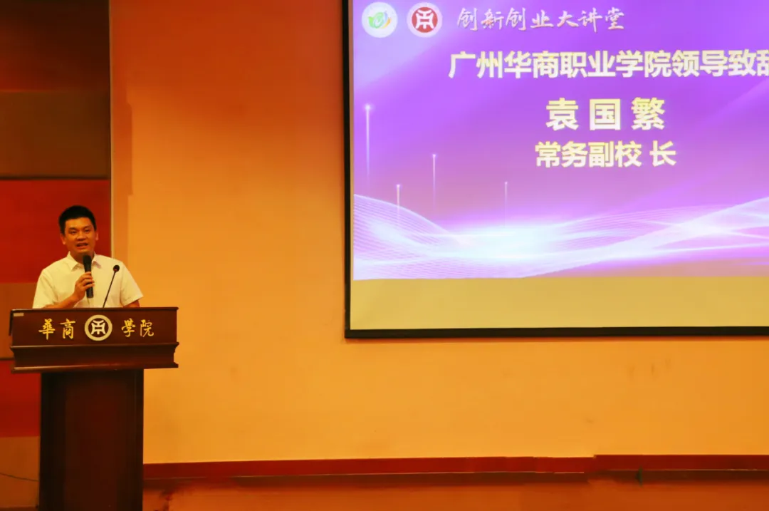 广州华商职业学院常务副校长袁国繁在致辞中强调了本次讲座的重要意义及创新创业的重要性,他鼓励同学们要珍惜学习机会,深入聆听主讲嘉宾的分享,从中获取灵感和力量,勇于突破传统思维的束缚,勇敢面对困难和挑战,在实践中积累经验,持续提升自身能力。他希望通过此次活动,加强学校与增城创新创业协会及社会各界的联系与合作,共同为学生的创新创业提供更多支持与帮助,为培养更多优秀创新创业人才而努力。