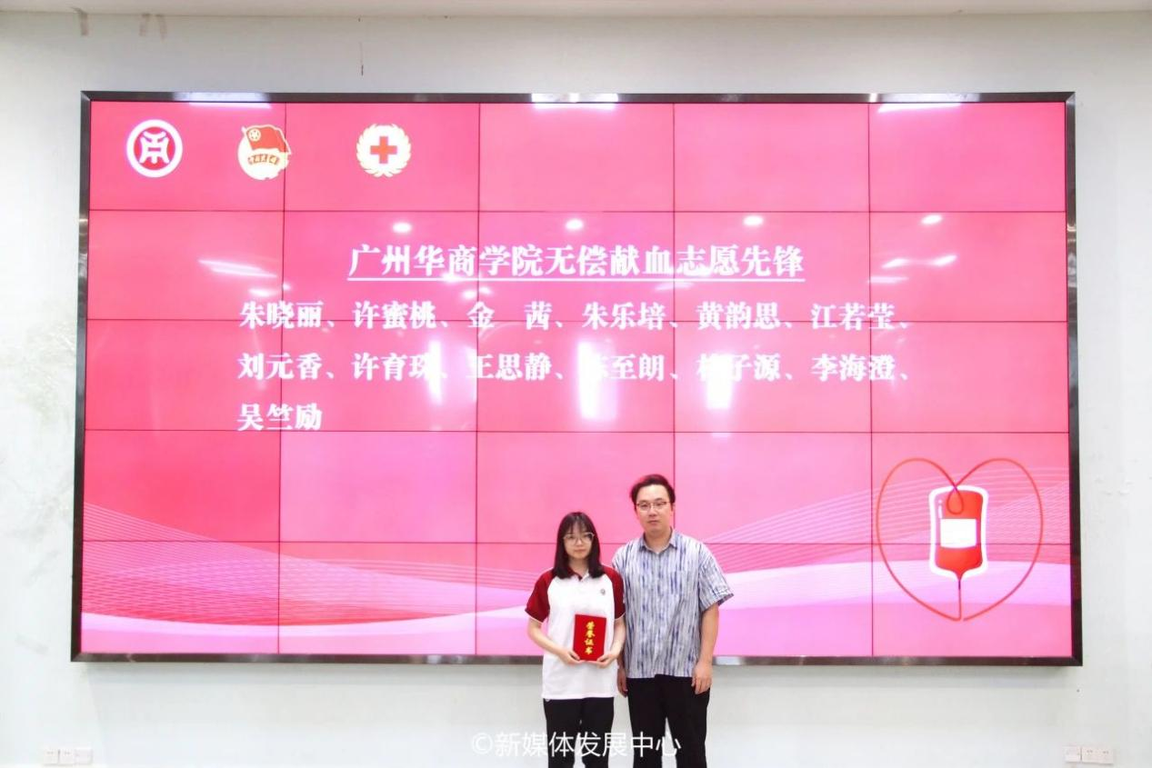 增城区血站血源科黄斯瑜老师为“广州华商学院无偿献血先进集体”颁奖。