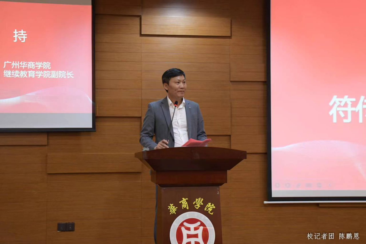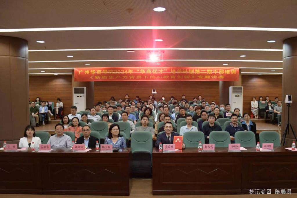 为加快培育新质生产力,积极应对AI应用普及和创新发展对组织管理者领导力提出的新要求,助力学校各项工作高质量发展,4月10日下午,我校“华商优才”培养计划第二期干部培训以线上+线下的方式在两校区进行,主会场设在广州校区中央图书馆报告厅,肇庆校区设立分会场。党委书记陈玉欢,副校长范忠宝、吕峻闽、许娜,学校顾问郭银华教授及校长助理、中层干部、各教学单位系(副)主任、三院校代表、集团代表主会场参加培训。培训由继续教育学院副院长符传波主持。