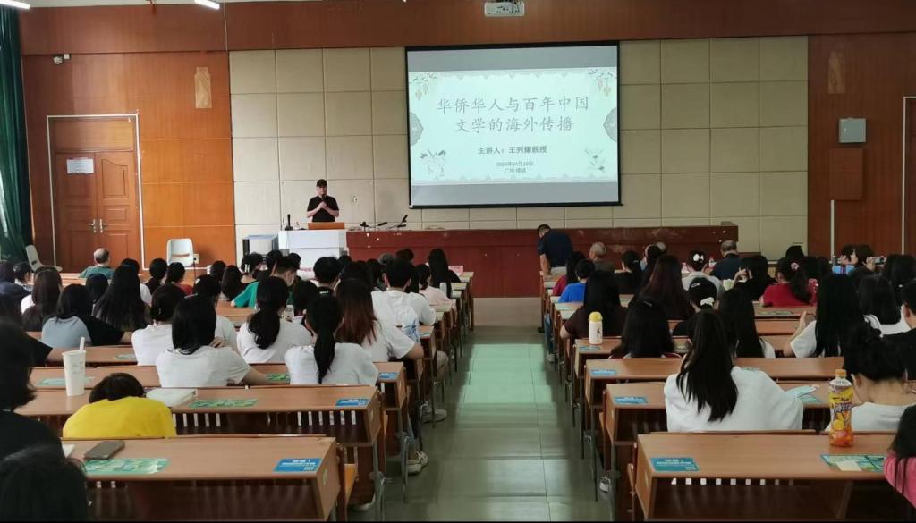 2024年4月28日下午,广州华商学院顾问王列耀教授应邀作“华侨华人与百年中国文学的海外传播”专题讲座。讲座由文学院院长陈少华教授主持。文学院党委书记、副院长郭堪通,副院长伍世昭、徐桃等嘉宾和300多名师生代表参加讲座。
