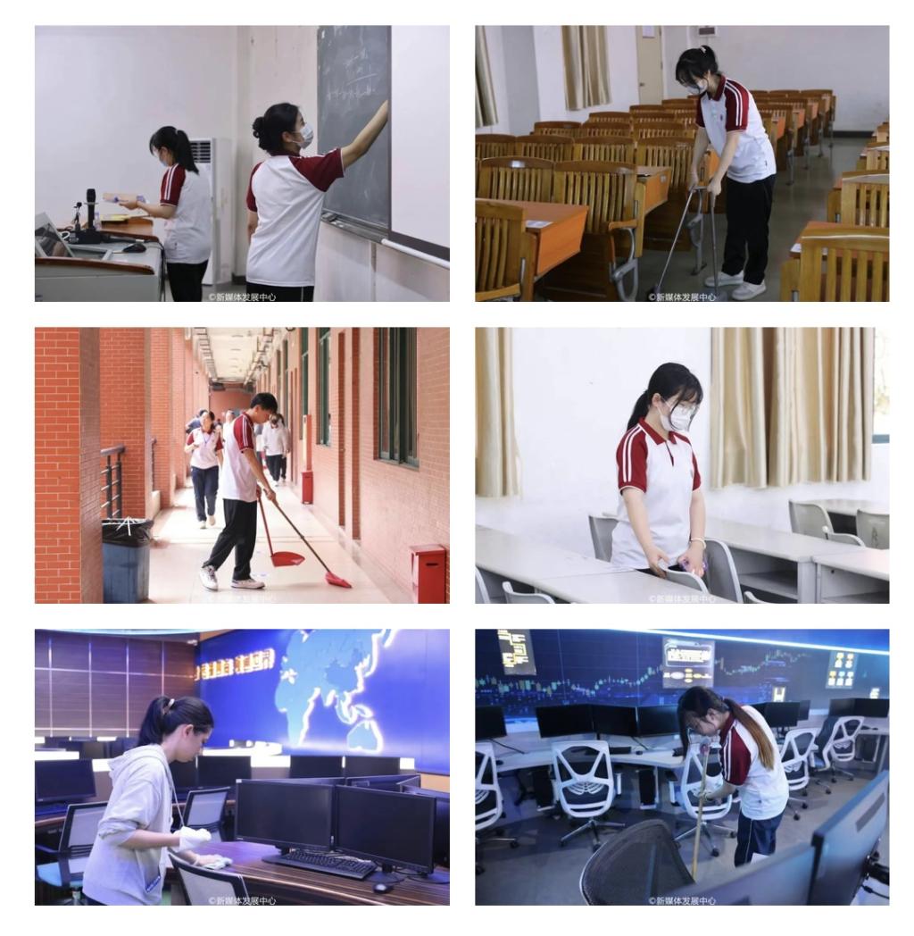 活动开始后,志愿者们服从安排,分工合作,互帮互助,带上劳动工具,对各自负责的区域进行清洁、整理。在励志楼、厚德楼,志愿者们清扫地面及卫生死角,将桌椅归置整齐,将黑板擦拭干净。他们不仅打扫教室卫生、清理楼栋之间绿化区落叶,还对公共设施、设备进行维护和保养,展现华商青年无私奉献的精神和积极向上的精神面貌。