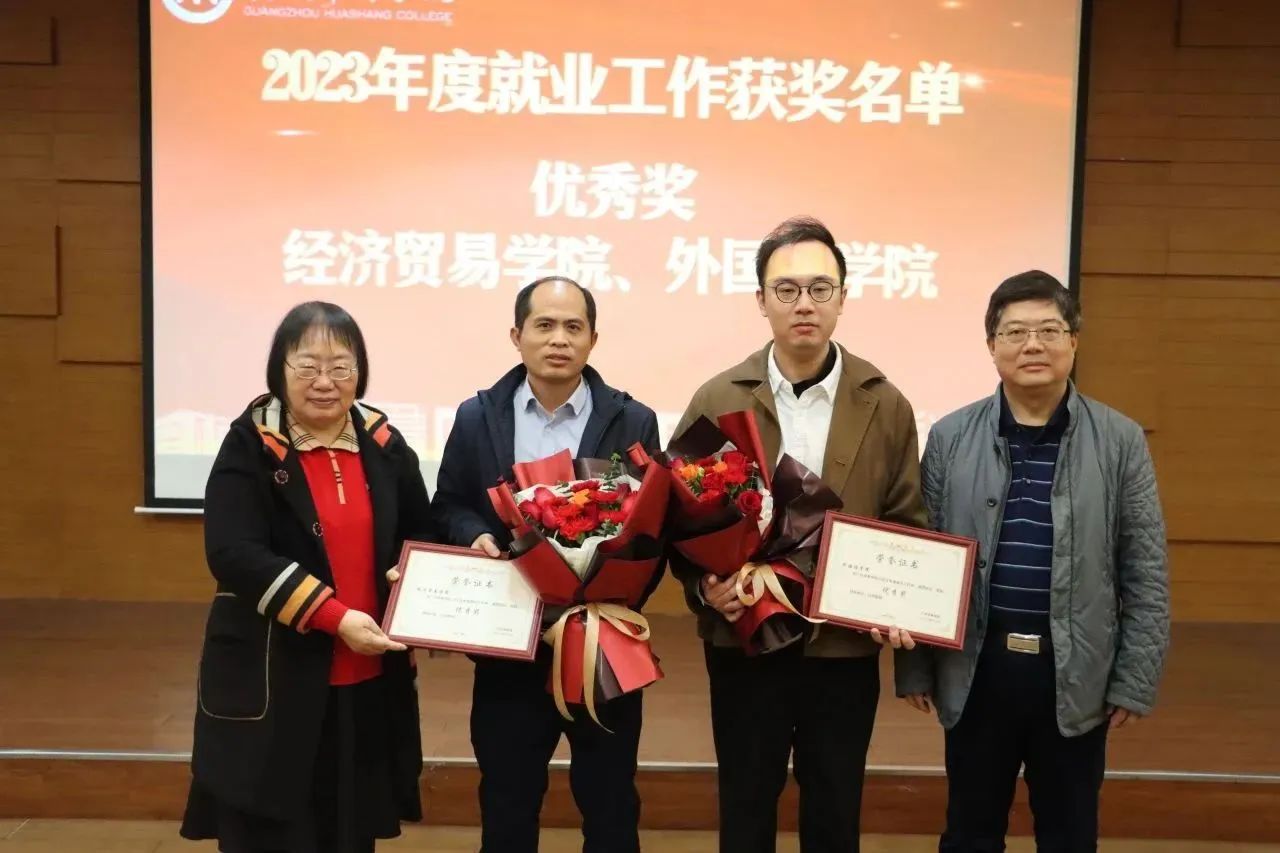 大会还对广州华商学院2023年就业工作先进单位和先进个人进行了表彰。执行校长郭银华宣读评选结果:教师教育学院获得2023届毕业生就业工作一等奖;健康医学院、国际学院获得二等奖;文学院、管理学院、金融学院获得三等奖;经济贸易学院、外国语学院获得优秀奖。授予张超、胡万培等9位老师2023届毕业生就业工作先进个人称号。与会校领导为先进单位和个人颁发荣誉证书。