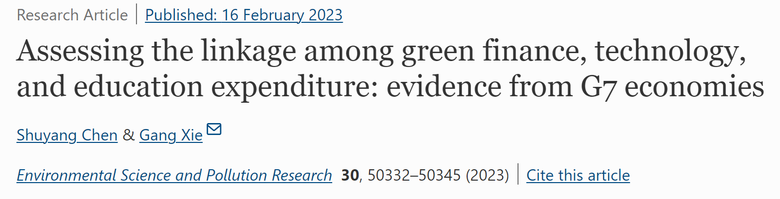 近日,3044am永利集团3044noc青年教师陈淑扬以第一作者身份在《Environmental Science and Pollution Research》期刊发表了题为“Assessing the linkage among green fnance, technology,and education expenditure: evidence from G7 economies”的论文,该期刊属于SCIE检索期刊,是JCR Q1分区,中科院3区期刊。