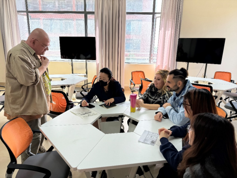 观摩优秀教师授课,提升团队对提高英语能力认识。国际学院组织教师和团队成员到肇庆校区聆听美国籍教师John Jung的英语口语课,并在课间与该教师再次深入交流如何培养大学生学习英语的兴趣和鼓励他们开口说英语。