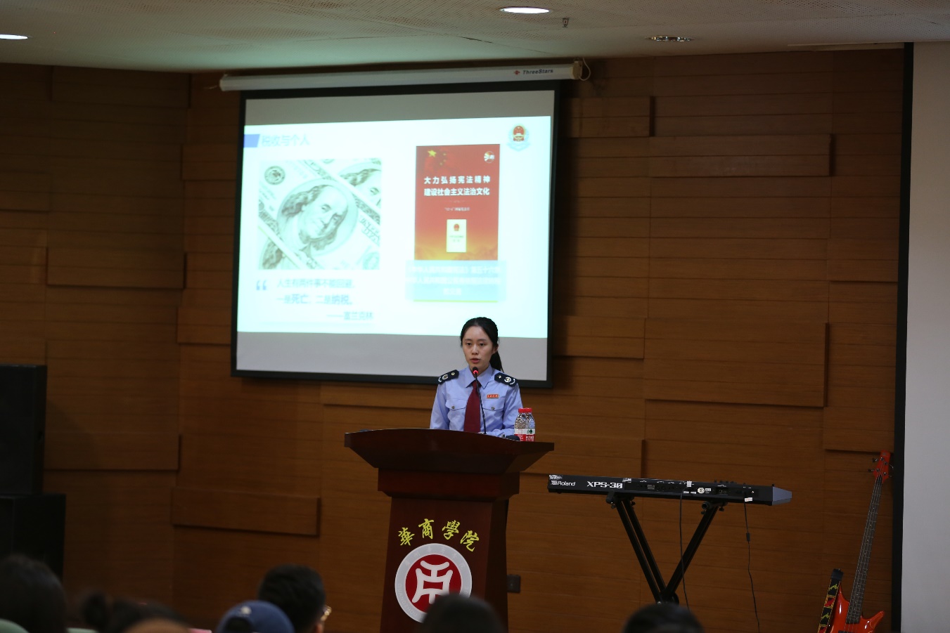 在随后的主题宣讲环节中,国家税务总局广州市增城区税务局税务干部姚绮琳与魏健怡分别以“大学生就业创业税收优惠政策”与“社保基础知识”为主题展开税收政策宣讲,给同学们进行了深入浅出的讲解。