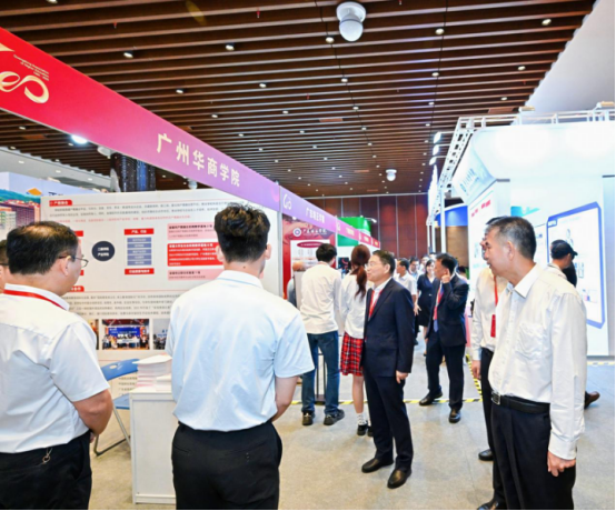 大会正式发布《广东高校服务教育强国和强省建设倡议书》,凝聚全省高校行动共识,明确发展方向。在以“教育强国建设与广东高校使命”为主题的学术研讨会上,来自中山大学、暨南大学、华南农业大学、南方医科大学等高校的校长及专家,聚焦高校如何服务国家战略、优化前沿学科布局、应对数字化时代人才培养等核心议题展开深入研讨,为广东高等教育高质量发展建言献策。大会设立的高等教育成果专题展亮点纷呈,集中展示了广东高校、科研机构及企业在人才培养、学术研究、科技研发与服务社会等方面的卓越成果与创新力量。广州华商学院的展位呈现了学校在推进科学研究、人才培养、产教融合、国际交流与合作等方面所取得的丰硕成果。与会领导嘉宾对我校的发展成果给予肯定。