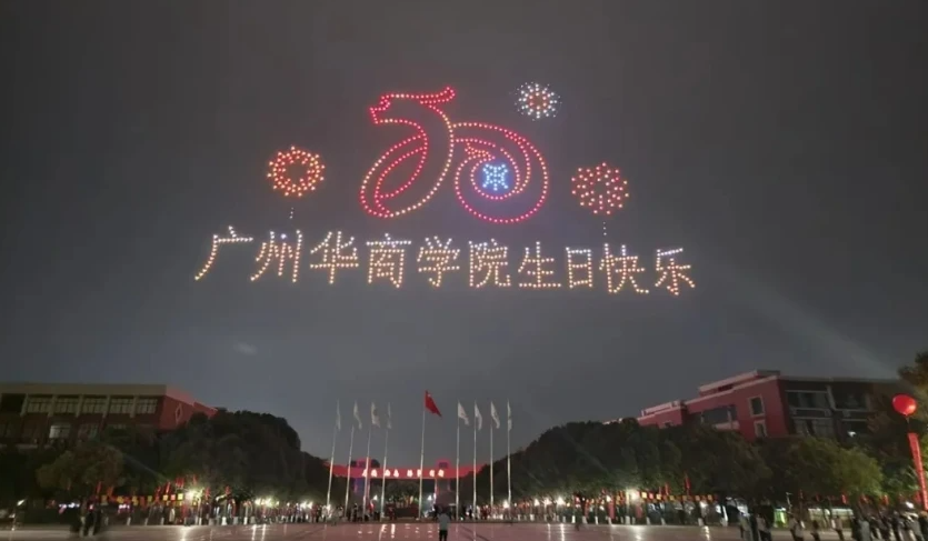 夜幕降临,在广州校区中央图书馆操场上,1000架无人机在空中编队飞行,以《二十正青春 华商向未来》为主题,展现创校之光、立校之魂、育人之基、奋进之路、攀登之梯、美育之果、拥抱之姿、笃行之力、办学之魂等字样与图案,灯光在夜空中勾勒出母校的发展轨迹与美好愿景。当天,由华商师生自编自演的原创大型舞台音乐剧《华商正茂》正式首演。