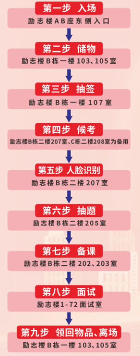 注意:只允许带身份证、准考证,其他物品存放在储物室,面试后凭号码牌取物。再抽签,沿地面的脚印贴纸到抽签室。