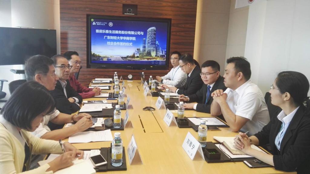 2017年10月25日上午,我院与雅居乐雅生活集团联合举办了校企合作协议签约会议。参加会议人员有华商学院郭银华副院长、教务处源国伟处长、经管学院平海副院长、王海燕主任、工商系潘思媚主任、实践科陈宏敏科长及雅生活集团人力行政中心李昌阳副总经理、雅卓营销公司张健强总经理、物业公司曾勇华副总经理、雅卓营销公司李月华人力行政部总监、人力行政中心刘雅宁资深经理。