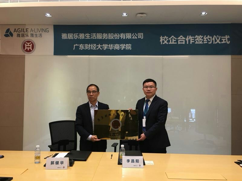 上午10:30时,郭银华副院长、李昌阳副总经理分别代表华商学院和雅生活集团有限公司庄重签署合作协议。华商学院同时授予“广东财经大学华商学院校外实践教学基地”铜牌,并颁发了校外实践导师聘书。