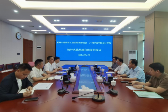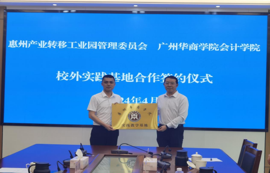 姚凤民院长从为工业园提供服务,开展财务会计的公益讲座等方面提出实践基地发展的期望。姚凤民院长和谢帆宇副主任代表校企双方签署了《广州华商学院校外实践基地合作协议书》。吕峻闽副校长为惠州产业转移工业园管理委员会授予“广州华商学院实践教学基地”牌匾。