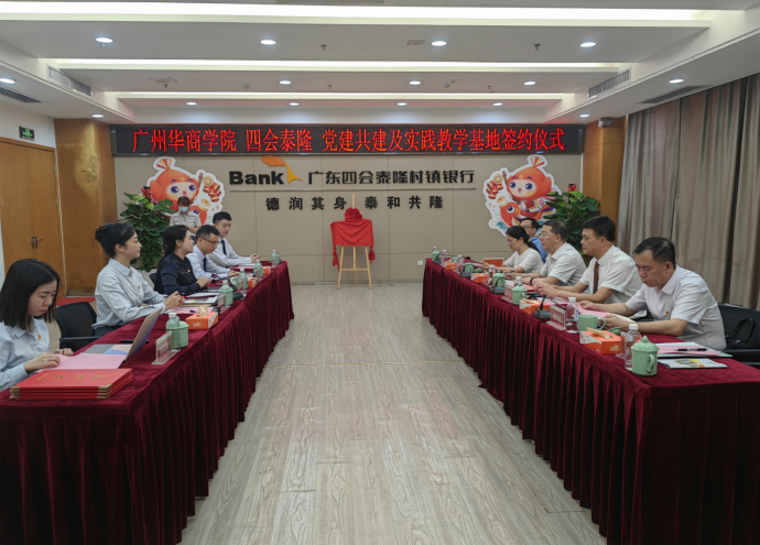 为深入贯彻落实党中央、国务院关于“稳就业”“促就业”决策部署,充分发挥校企党建合力,推进党建与业务深度融合,赋能毕业生高质量就业,5月9日下午,广州华商学院副校长吕峻闽、肇庆校区党委书记苏宁、肇庆校区党委副书记覃少冰、3044am永利集团3044noc院长姚凤民、3044am永利集团3044noc副院长刘善球、3044am永利集团3044noc学工办副主任杨烨瀚一行赴广东四会泰隆村镇银行开展访企拓岗专项活动,并举行党建共建、实践教学基地签约仪式。