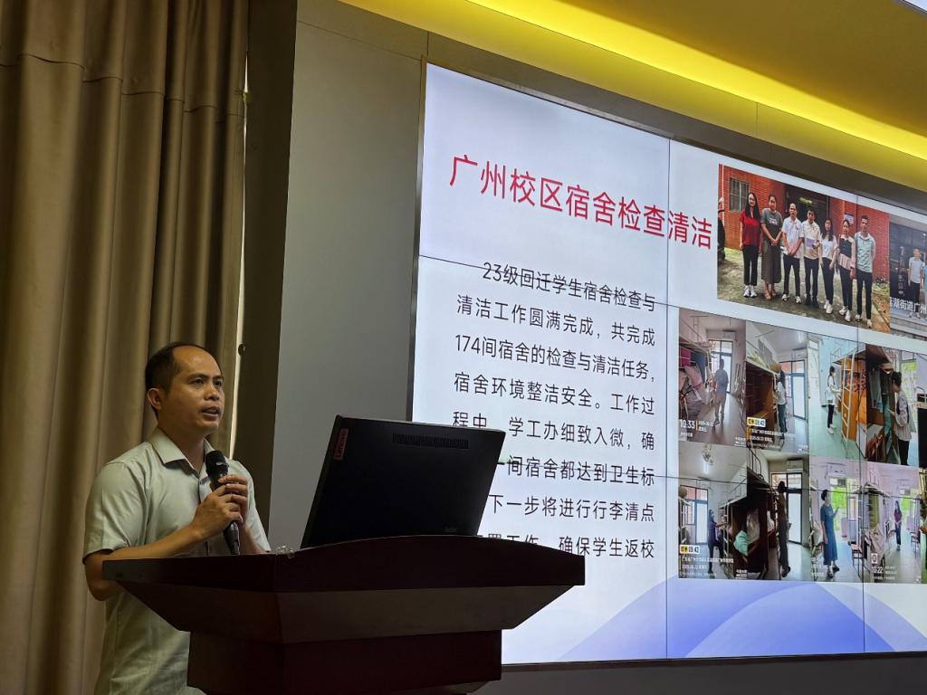 陈少鸿副院长从假期学生宿舍检查清洁、学生暑期社会实践、学生就业促进及合格评估准备工作进行了全面汇报。他指出,新学期学院已实施社区辅导员驻楼办公制度、落实班主任选聘考核与津贴激励机制,完成了两轮新生电话回访并制定迎新方案。他表示,学院下一步将从“以评促建、夯实基础、突出实效、规范管理”四个维度持续发力,全面提升学生工作水平。