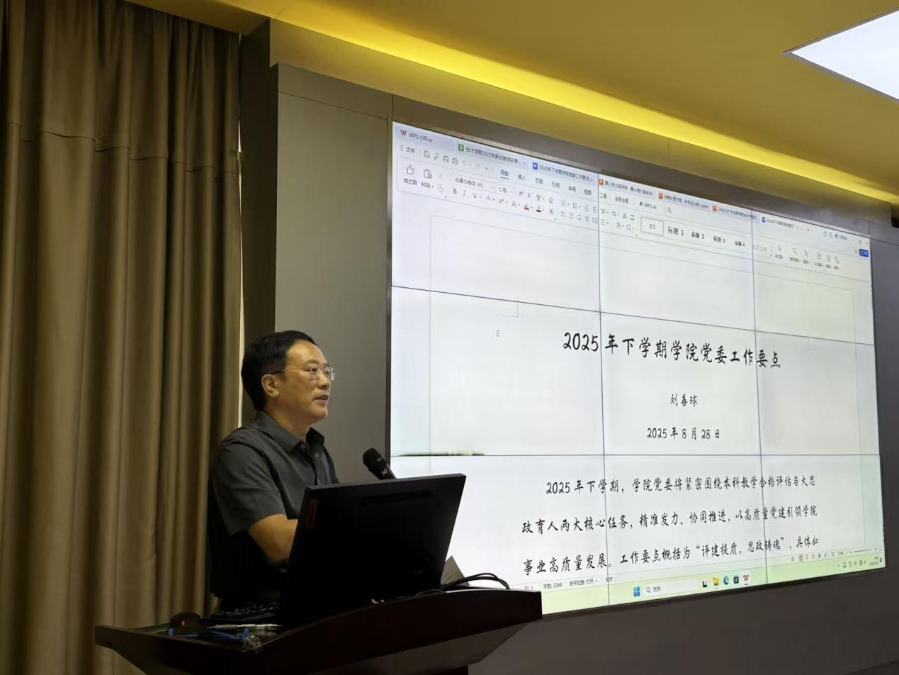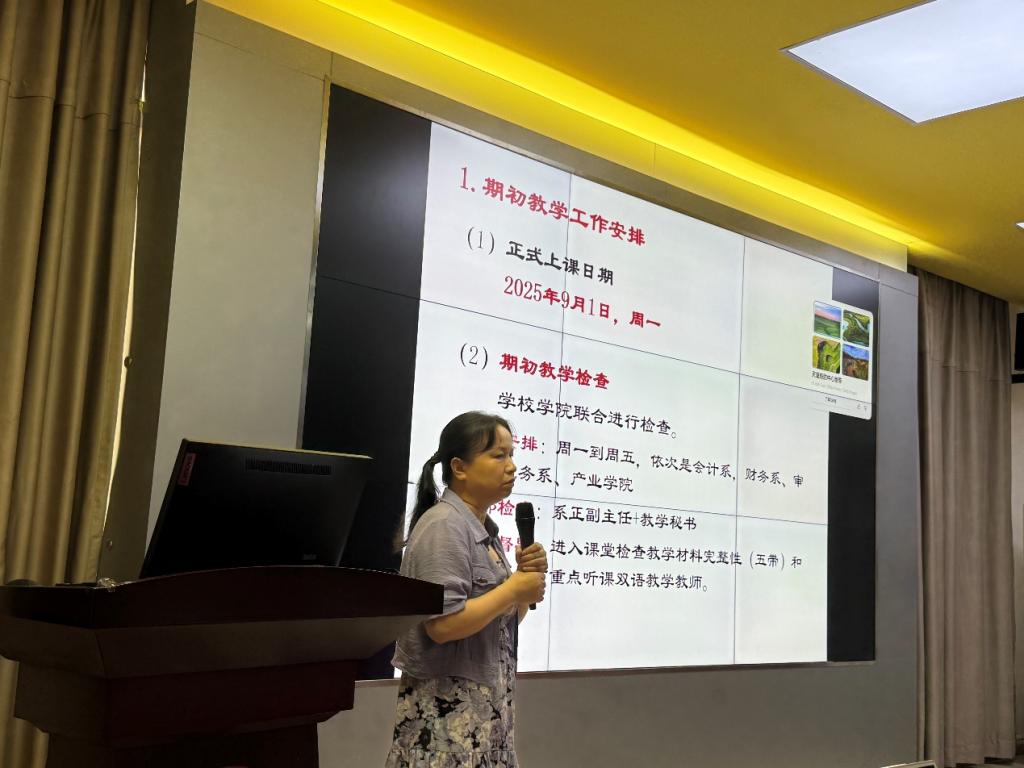 杨旻副院长部署了新学期期初教学工作,要求全体教师高标准做好开学准备,学院将通过期初教学检查保障教学运行即刻入轨、秩序井然;同时明确需开展上学期试卷自查互查,及时整改问题并完成归档。她还介绍了学院专业建设进展,包括2025版人才培养方案修订、会计学专业方向调整及课程建设情况,强调教师要积极申报2025年校级质量工程项目,今年需结题的项目要做好验收准备。最后,她对暑假期间加班整改评估材料的教师表达了诚挚谢意。