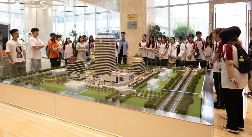 参观首站,师生通过沙盘模型全面了解园区整体规划与产业布局,通过动态模型了解园区“跨境电商+智能制造+数字服务”的产业生态布局,直观认知生态园“科技+商业+生态”三位一体的发展理念,为后续实践奠定基础。