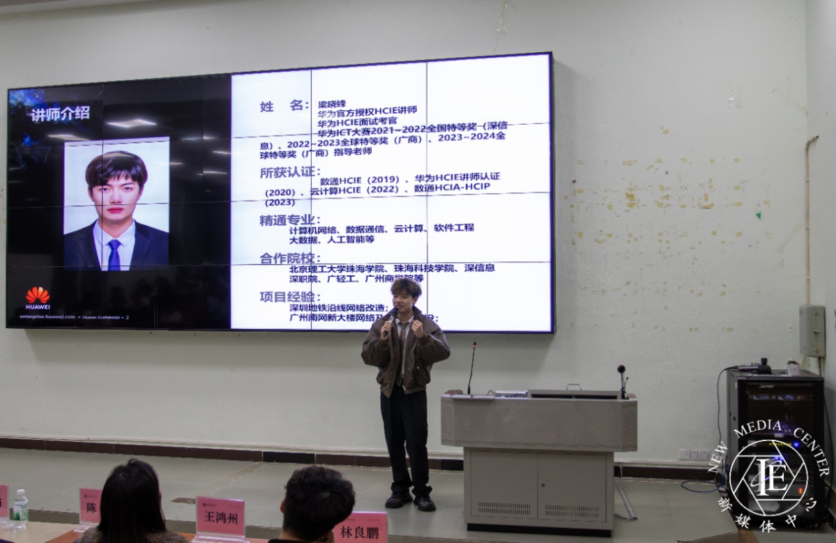 2025年3月12日,华为网络技术有限公司与广州华商学院人工智能学院联合举办的华为SD技术分享交流会在热烈的掌声中拉开帷幕。华为授权HCIE专家梁晓峰,广州腾科网络技术有限公司产教融合项目经理陈聪,广州腾科网络技术有限公司咨询经理王鸿州、林良鹏,人工智能学院副院长杨波,计算机系主任黄富平,辅导员周俊杰老师,学院产教融合办公室行政秘书王坤莅临此次交流会现场,帮助同学们更好地了解和掌握ICT(信息通信技术)领域的前沿知识,并为其未来的职业发展指明方向。