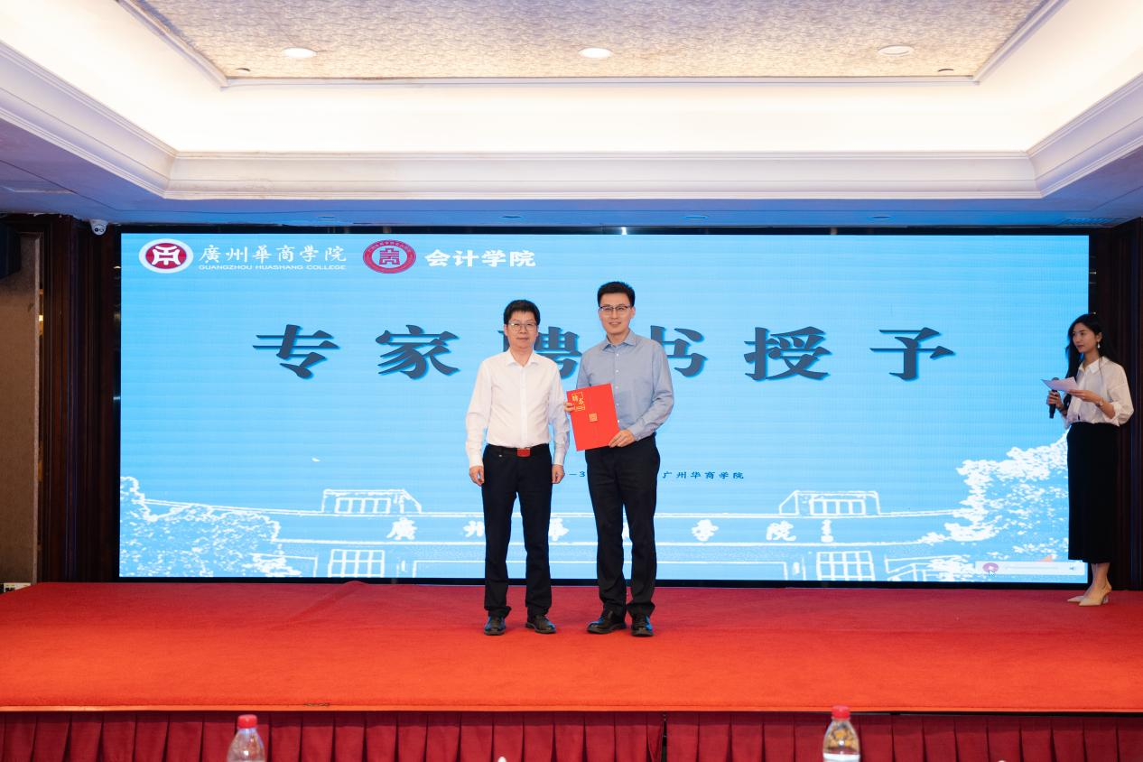 广州华商学院校长助理张军教授为华南师范大学马克思主义学院张永刚教授颁发专家聘书。