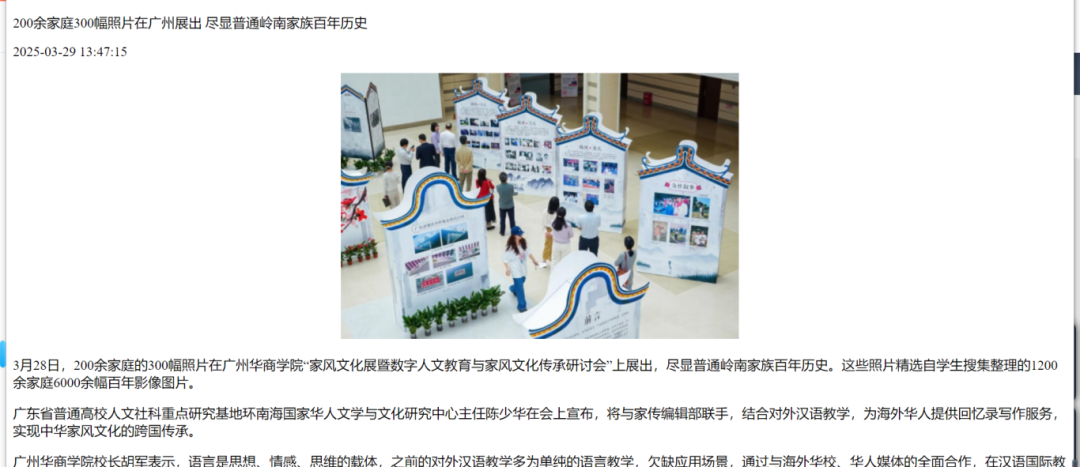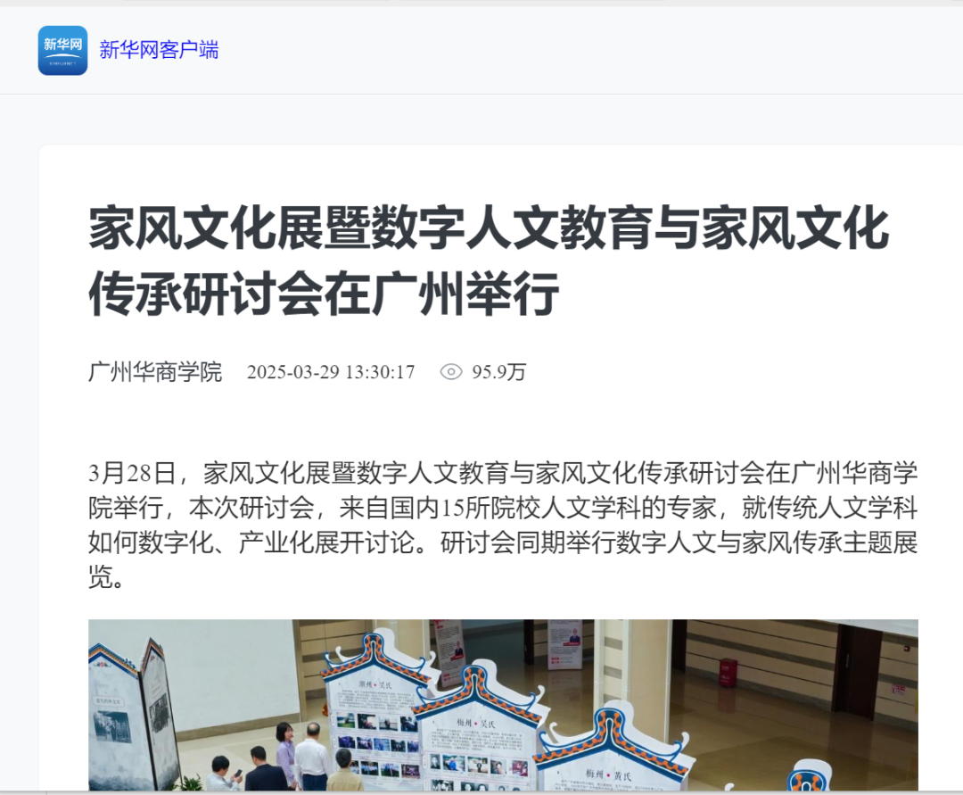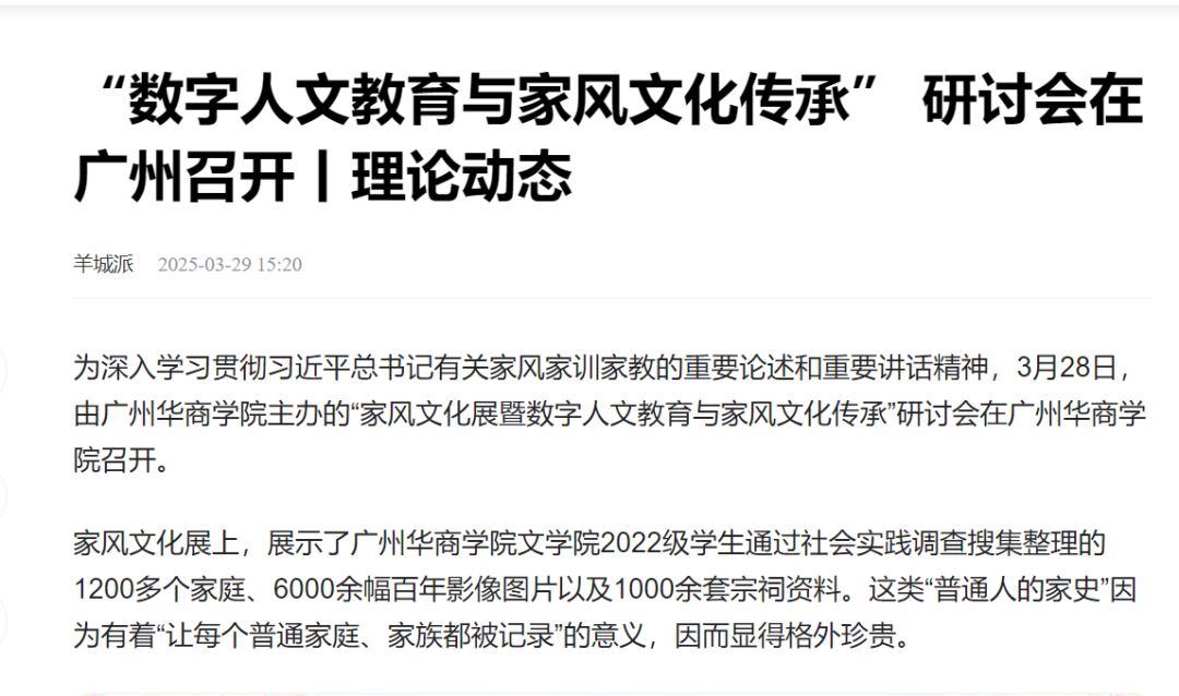 近日,广州华商学院文学院举办的“家风文化展暨数字人文教育与家风文化传承研讨会”引发广泛关注。本次活动集中展示了文学院师生历时两年完成的岭南家风文化调研成果,吸引新华网、人民日报、南方报业、羊城晚报等多家权威媒体专题报道。