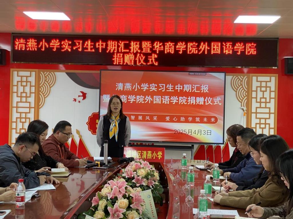 2025年4月3日下午,广州华商学院外国语学院一行前往增城区清燕小学实习基地进行走访交流。清燕小学副校长黄叔清、党务专干蒋建娟、英语科科长郑群花和实习指导教师们,以及外国语学院教学院长杜秀君、翻译系主任贾秀海、英语系副主任谢瑶、苏恒老师、肖茜老师和本学期实习生共同参与了此次活动。