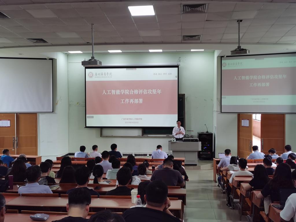 2025年4月22日下午,广州华商学院人工智能学院在励志楼D408召开2024-2025第二学期第二次全体教职工大会。会议围绕合格评估,对学院重点工作进行了再部署和再动员。会议由戴经国院长主持,学院全体教职工参会。
