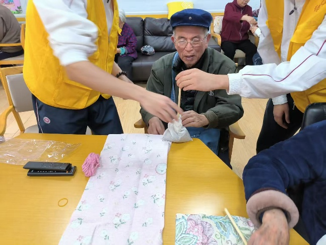 2025年4月7日,志愿者们耐心讲述艾草锤在传统民俗文化里的美好寓意及制作方法。活动中,在志愿者们的轻声鼓励、指导和帮助下,长者们弯折、包裹艾草,用棉线紧密缠绕着艾草包。大家相互交流经验,分享让艾草锤形状更饱满、造型更新颖的小窍门,现场满是欢声笑语与艾草清香。