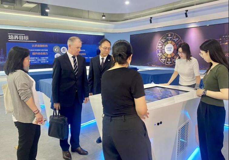 在参观过程中,王文忠处长向代表团详细介绍了数字金融实验中心实验教学平台建设理念与功能布局。该平台是省级实验教学示范中心,配备先进的以银行为主的金融机构运营模拟,致力于培养学生掌握金融机构运营的能力、AI算法应用及人机交互设计等领域的实践能力。John Molony副校长对中心的前沿设施表示高度赞赏,称赞其“展现了技术应用与社会需求的深度结合”。