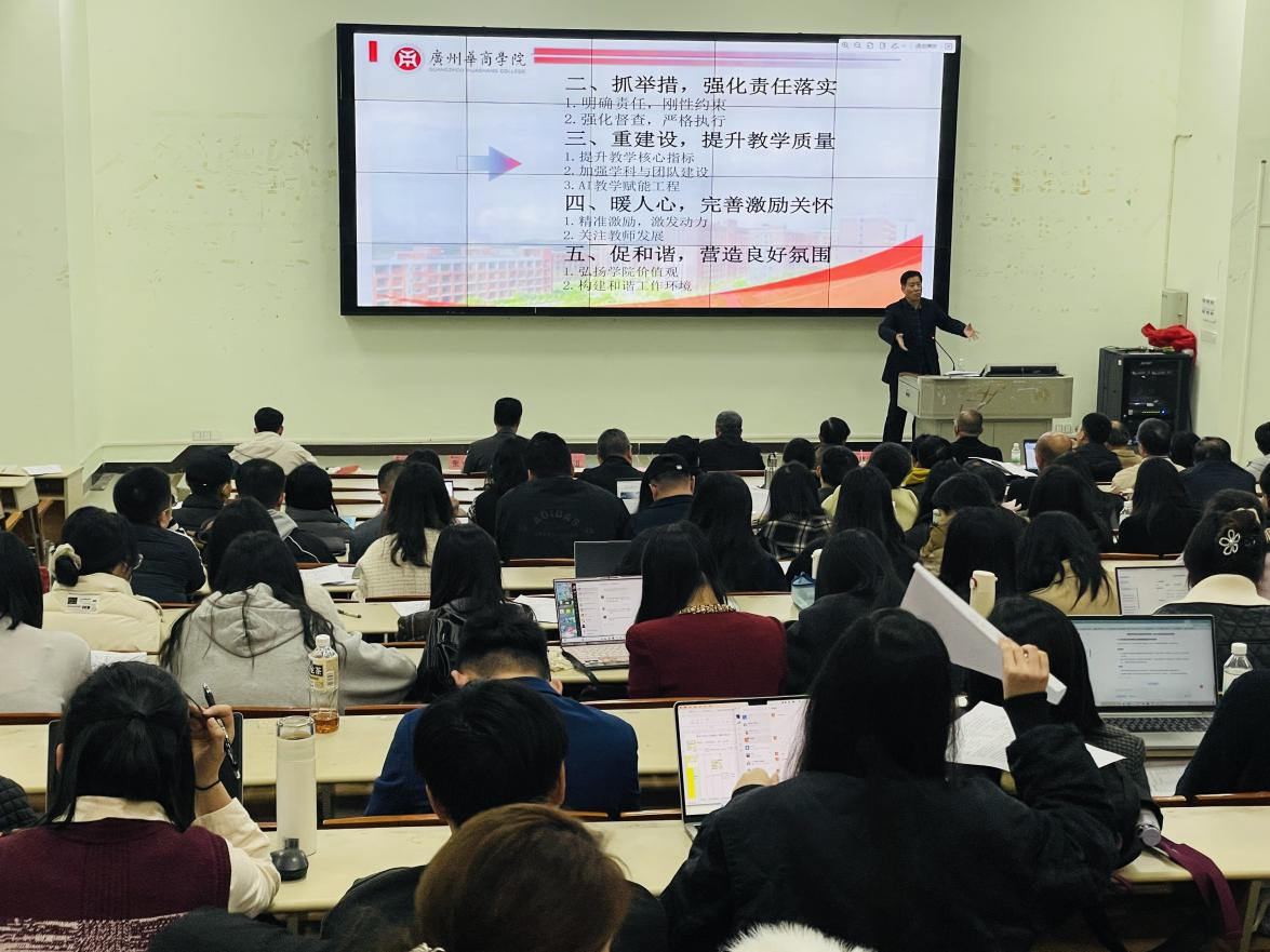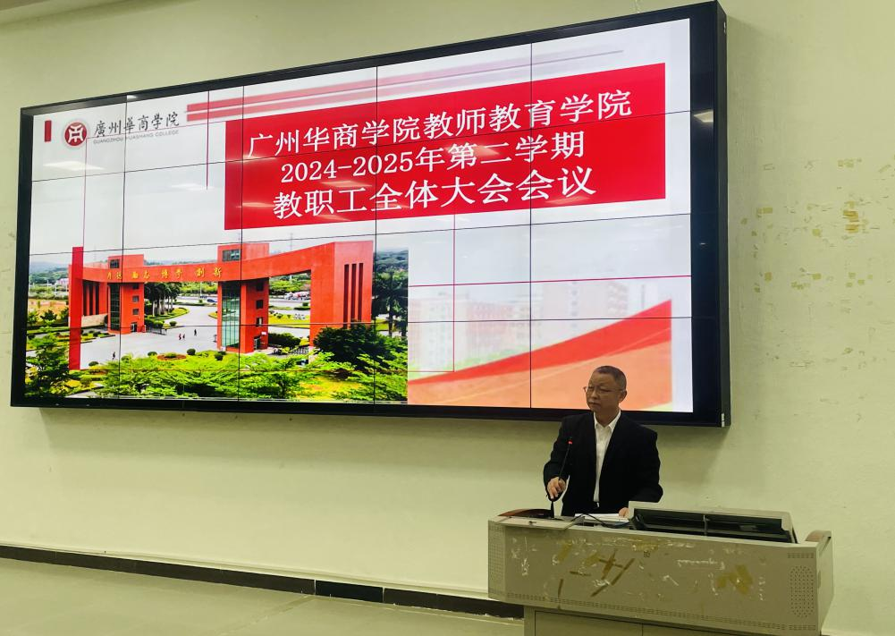 2025年2月25日,广州华商学院教师教育学院在励志楼B207召开全体教职工大会。本次会议由学院党委书记陈上仁主持,全体教职工齐聚一堂,共同聚焦学院发展、共商教育教学大计,全力为本科教学工作合格评估做准备。