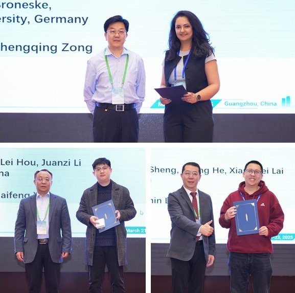 在开幕式重要环节中,大会组委会隆重揭晓了本届最佳论文奖获奖名单,宗成庆教授、广财大于海峰校长以及我校吕峻闽副校长为3位获奖学者颁发了这一荣誉。会议开幕式由中山大学韦景竹教授主持,大会主旨报告由广东外语外贸大学蒋盛益教授和华南师范大学郝天永教授分别主持。