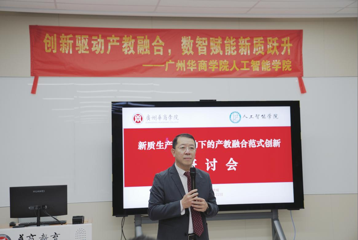 2025年3月22日下午,广州华商学院人工智能学院在弘美楼310室成功举办了主题为“新质生产力驱动下的产教融合范式创新”的研讨会。此次研讨会汇集了学术界与产业界的多位专家和领导,共同探讨在人工智能时代下,如何通过产教融合的新模式与新路径,促进教育与产业的深度结合,培养适应未来科技发展的高素质人才。出席研讨会的嘉宾与领导包括:华为智能化研发技术专家付求爱,青软创新科技集团股份有限公司副总裁韩涛,东莞理工学院工业软件学院副院长丁凯,广州华商学院党委副书记、纪委书记兼副校长吕峻闽,人工智能学院副院长叶仕通,党委副书记兼副院长陈洋广,院长助理洪绍勇、杨本胜,以及人工智能学院全体教师。研讨会由广州华商学院人工智能学院党委书记、副院长杨波主持。