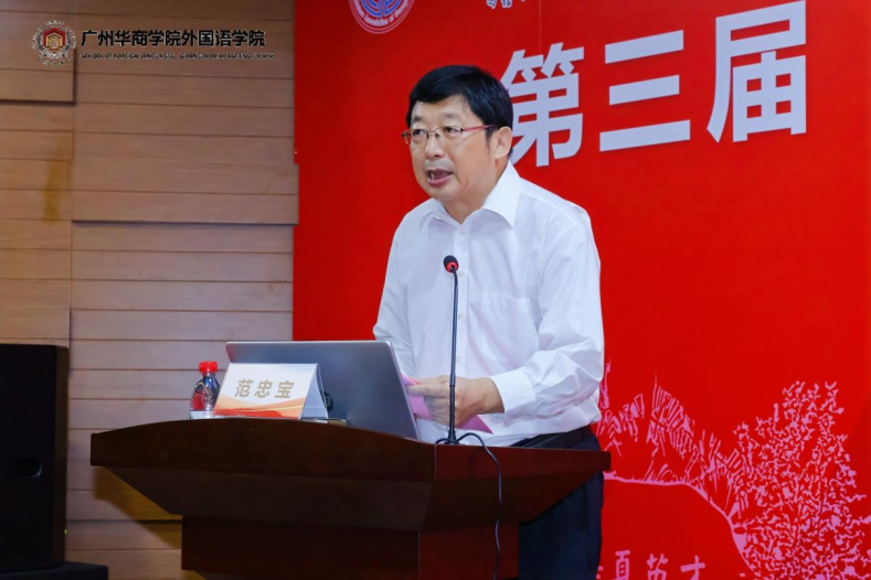 广州华商学院副校长范忠宝教授代表学校致欢迎辞。范副校长指出,在推进中国式现代化和努力构建人类命运共同体的新的时代背景下,助力中国文化“走出去”,讲好中国故事、传播好中国声音、续写“一带一路”建设新篇章是翻译研究与语言服务领域专家和学者的重要课题和光荣使命。在我校召开的“第三届‘一带一路’倡议背景下翻译研究与语言服务高端论坛暨文化传播翻译人才培养专题研讨会”具有鲜明的时代意义和现实价值。本次研讨会,国内翻译研究与语言服务领域的众多权威专家与学者齐聚广州华商学院,即是学校的荣耀,也是华商外语学人难得的学习机会。他预祝研讨会取得圆满成功并希望华商外国语学院教师,把握这个宝贵的机会,积极参与讨论,多向专家、学者请教,共同推动翻译研究与语言服务的高质量发展。