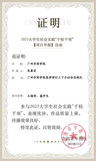 2024年,王海传教授指导“筑梦前行”社会实践团队以“科教下乡,助力白垢振兴”为主题,于5月、7月、9月在广东省肇庆市白垢镇开展志愿服务活动。活动内容共有6项:支教、墙绘、党课宣讲、公益捐赠、联谊助农、回访留守老人等。其中,支教受教的小学生达86人,支教时长为15天。团队活动事迹获得南方日报、西江日报、封开发布、封开县融媒体中心、封开县融媒体中心视频号、封开共青团、网易新闻、大学生云报等传媒广泛报道。南方日报对其活动事迹进行展示,展示数据及评价为:累计阅读量23000+,公众号推文阅读量8900+,抖音号视频播放量44000+,微信视频号播放量10000+,累计点赞量5700+;此次实践活动为白垢镇的教育、乡村风貌、农业发展和文化宣传带来积极影响,展现了青年学子助力乡村振兴的担当与作为。日前,王海传教授获评2024年广州华商学院暑期社会实践活动“优秀指导老师”称号,所指导的团队获评广州华商学院“优秀团队”称号,实践队队长朱嘉宜、队员吴曦获评“优秀个人”称号;团队作品入选中国青年报社2024年“千校千项”工程(全校5项作品入选)。