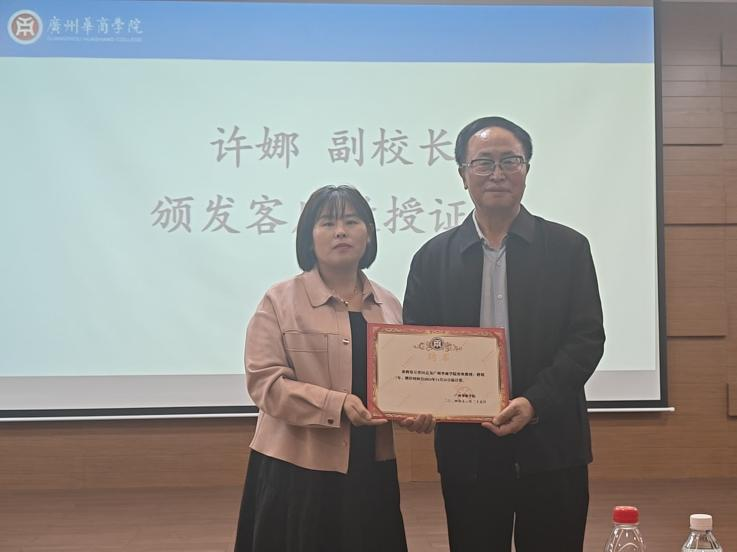 随后,广州华商学院副校长许娜为荀万祥校长颁发客座教授证书,并对荀万祥校长的精彩讲座表示感谢。她鼓励师生充分吸收荀万祥校长的宝贵经验,提升教育教学水平,为教育事业贡献力量。