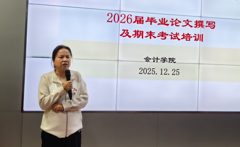 培训会上,主管教学副院长杨旻教授围绕毕业论文撰写核心要求,结合会计学科专业特点,从三个方面展开系统性、针对性讲解,逻辑清晰、重点突出。第一,全面介绍2026届本科毕业论文基本情况,杨院长介绍了本届毕业生数量及指导老师安排情况、论文工作时间节点及进度安排,强调要严格把控从选题、开题到论文撰写的全流程,确保工作高校推进、规范落地。第二,精准反馈开题报告审核发现问题,针对前期开题报告申报审核过程中发现的共性问题,如序号、参考文献等格式不规范、文献综述研究内容偏离论文主题、指导教师评语相似等,她直指问题核心,并提出具体整改建议。第三,细致讲解论文撰写应注意的问题,从标题拟定的精准性、摘要撰写的概括性、关键词选取的专业性,到正文逻辑的连贯性、图表呈现的规范性、参考文献引用的标准性,逐一梳理关键要点,着重强调学术写作规范与查重要求,针对AI技术应用趋势,指导老师做好AI辅助写作的引导与把关,提醒学生合理运用AI工具、杜绝直接照搬,坚守学术诚信底线,严格控制AI重复率。