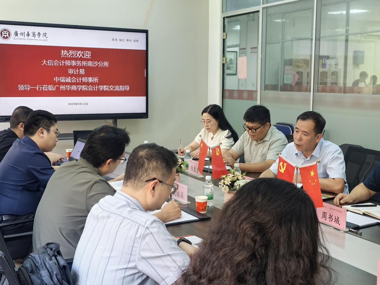 2025年9月12日,大信会计师事务所南沙分所高级项目经理邵磊、综合部经理王梦歌携达尔文智慧科技(广州)有限公司审计技术负责人-技术总监沈嘉迪、市场部负责人-运营总监蔡宝弘及中瑞诚会计师事务所权益合伙人、广东分所所长武栋梁莅临我院,就进一步深化校企合作进行了深入交流。院长姚凤民,副院长周书域,院长助理陈蒙梦,数智会计与商务服务产业学院副院长范卫星,会计系主任唐丽华,审计系主任张丽、副主任郭晨参加座谈会,会议由副院长周书域主持。