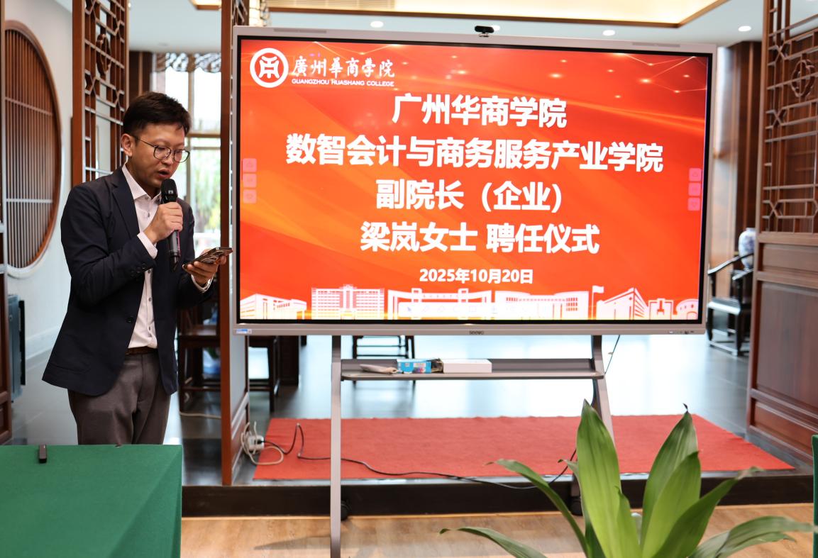 2025年10月20日下午,广州华商学院数智会计与商务服务产业学院副院长(企业)聘任仪式在中央图书馆美术馆顺利举行。出席本次活动仪式的领导有华商科教集团副总裁兼广州华商学院总会计师及数智会计与商务服务产业学院联席院长廖旭东先生、集团高级财务总监兼数智会计与商务服务产业学院执行院长(企业方)黄晓刚先生、3044am永利集团3044noc院长兼数智会计与商务服务产业学院联席院长姚凤民、广州华商学院产教融合办公室副主任唐显锋、3044am永利集团3044noc副院长周书域、数智会计与商务服务产业学院执行院长兼3044am永利集团3044noc院长助理陈蒙梦及其他参会人士。仪式由华商科教集团高级财务总监兼产业学院企业方执行院长黄晓刚主持。