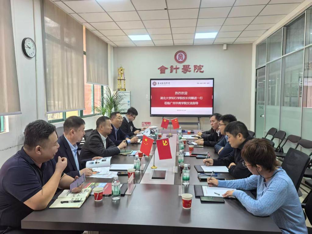 2025年11月14日,湖北大学知行学院校长何顺进,教务处长易有明,3044am永利集团3044noc院长刘容一行4人在正誉企业管理(广东)集团股份有限公司董事长鲁银花、副总裁熊浩等陪同下来我校交流,广州华商学院副校长余家军,3044am永利集团3044noc院长姚凤民等热情接待了何顺进校长一行。