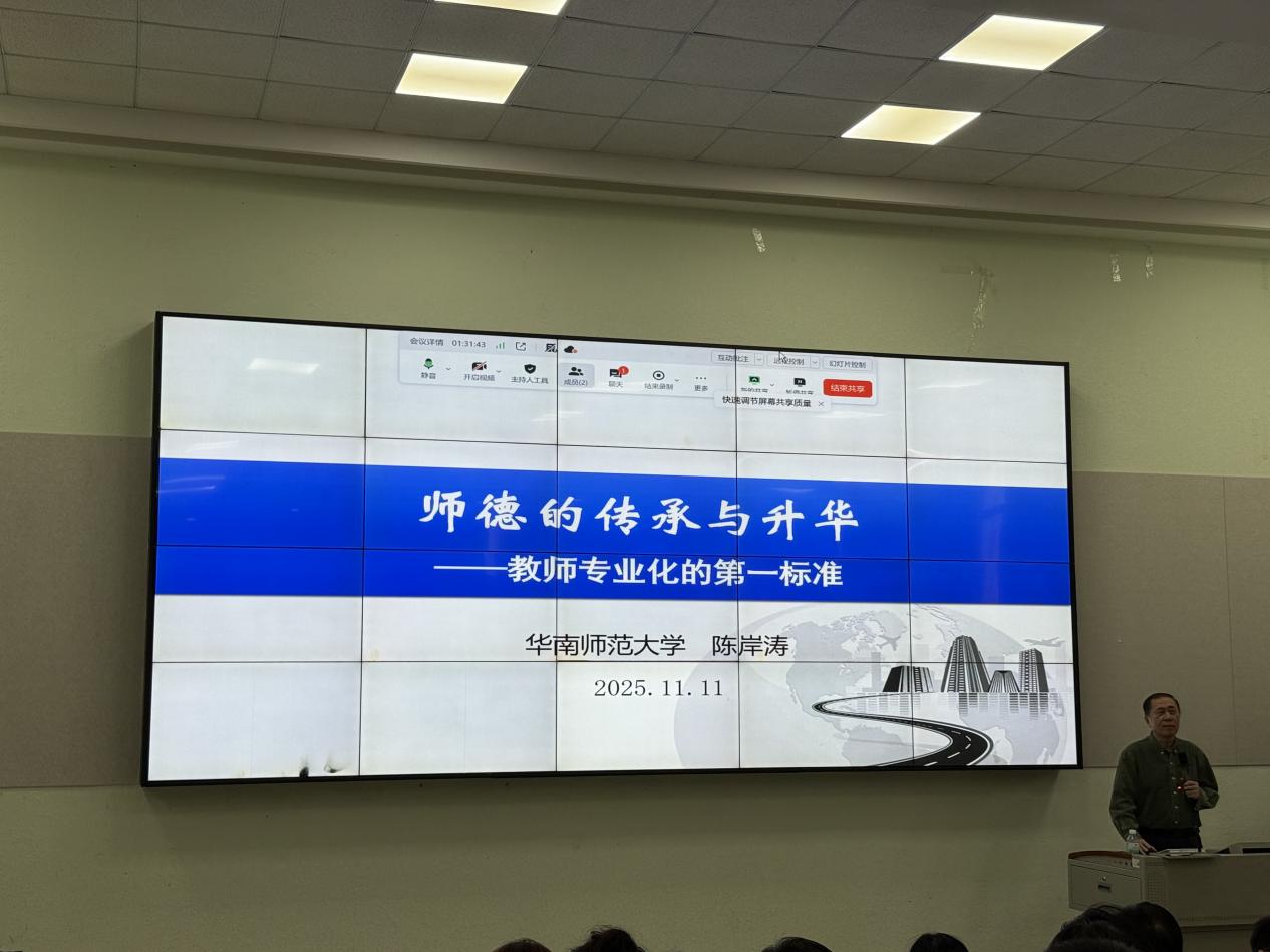 随后,华南师范大学的陈岸涛教授进行了题为《师德的传承与升华——教师专业化的首要标准》的专题培训。他指出,当前从事教师职业的大背景与以往存在较大差异,社会对教师的要求也在持续提升。此外,陈岸涛教授还分享了一些高校教师的典型案例,生动地阐释了师德的内涵。他强调了师德师风建设的重要性,提倡教师树立正确的职业动机,并鼓励大家以史为鉴,向优秀榜样学习,践行“四好老师”的标准,即教师应具备“理想信念、道德情操、扎实知识、仁爱之心”。最后,他着重强调了师德传承的深远意义,指出教师的职业道德水平高于大多数职业,教师是全体学生的榜样,也是社会的示范者。他进一步指出,社会对教师的期望较高,因此教师需具备强烈的职业认同感和高度的职业社会责任感。
