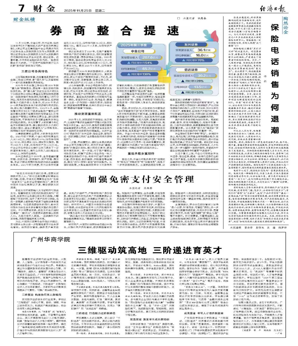 11月25日,《经济日报》第七版以“三维驱动筑高地,三阶递进育英才”为题报道了广州华商学院数智化会计人才培养模式,展现了我校在深化产教融合、培养复合型数智财会人才方面的显著成效与示范影响力。