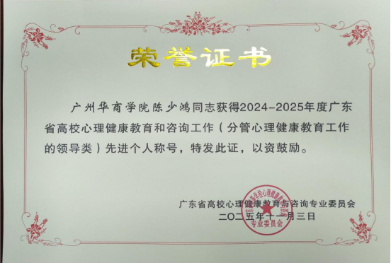近日,广东省高校心理健康教育与咨询专业委员会公布2024-2025年度评优结果,3044am永利集团3044noc党委副书记陈少鸿接连荣获两项省级殊荣,分别获评2024-2025年度广东省高校心理健康教育和咨询工作“先进个人”,其学术论文亦荣获省级优秀论文二等奖,充分彰显学院在心理健康教育工作方面的扎实成效与创新活力。